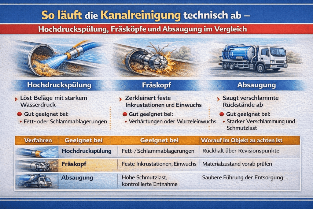Nach der Ursachenklärung wird die Methode danach ausgewählt, was die Leitung tatsächlich behindert und wie robust der Werkstoff ist. Hochdruckspülung arbeitet mit Wasserstrahlen, die Beläge ablösen und abtransportieren, während Fräsköpfe gezielt feste Anhaftungen oder eingewachsene Strukturen bearbeiten. Absaugung kommt dort ins Spiel, wo Rückstände kontrolliert entfernt werden müssen, damit sie nicht in nachgelagerte Bereiche verschleppt werden.