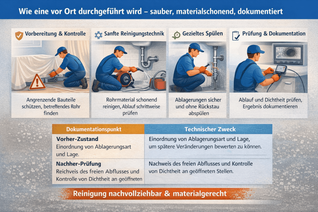 Die Durchführung beginnt mit dem Schutz angrenzender Bauteile und der Kontrolle, welche Leitung tatsächlich gereinigt werden muss, damit keine falschen Stränge bearbeitet werden. Am Standort wird die Reinigung so angesetzt, dass Dichtungen, Rohrinnenflächen und Übergänge nicht unnötig belastet werden, weil gerade dort Folgeschäden entstehen können.