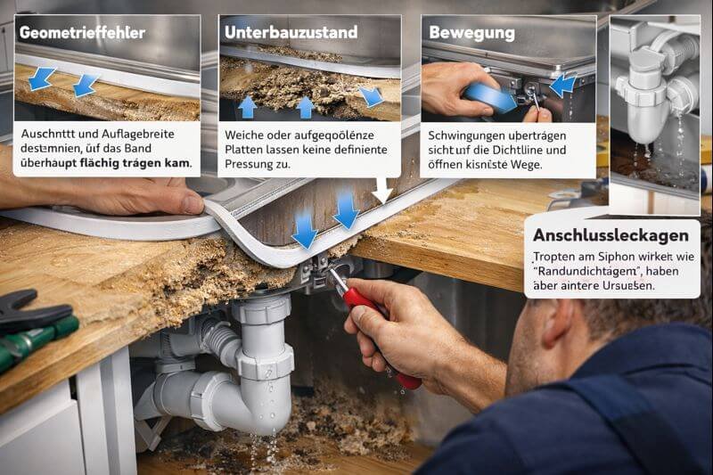 Undichtigkeiten beim Spüle einbauen Dichtband entstehen häufig nicht an einer einzigen Stelle, sondern durch eine Kette kleiner Abweichungen: ein minimal zu großer Ausschnitt, ein verzogener Beckenrand, eine ungleichmäßig angezogene Klammer und dazu Reinigungswasser, das regelmäßig in die Randzone läuft. In Summe reicht das, um Feuchte hinter die Auflage zu ziehen.
